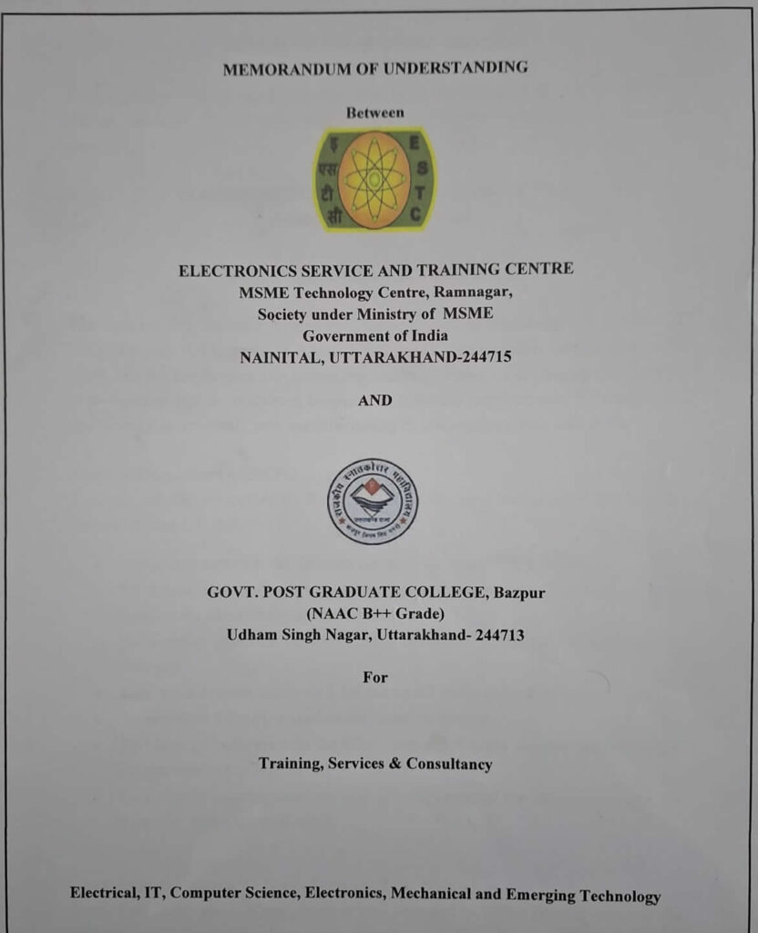 Bazpur: Government Post Graduate College (GPGC), Bazpur has signed a Memorandum of Understanding (MoU) with Electronics Service & Training Centre (ESTC), Ramnagar to strengthen collaboration in the areas of training, technical services, consultancy, and skill development.